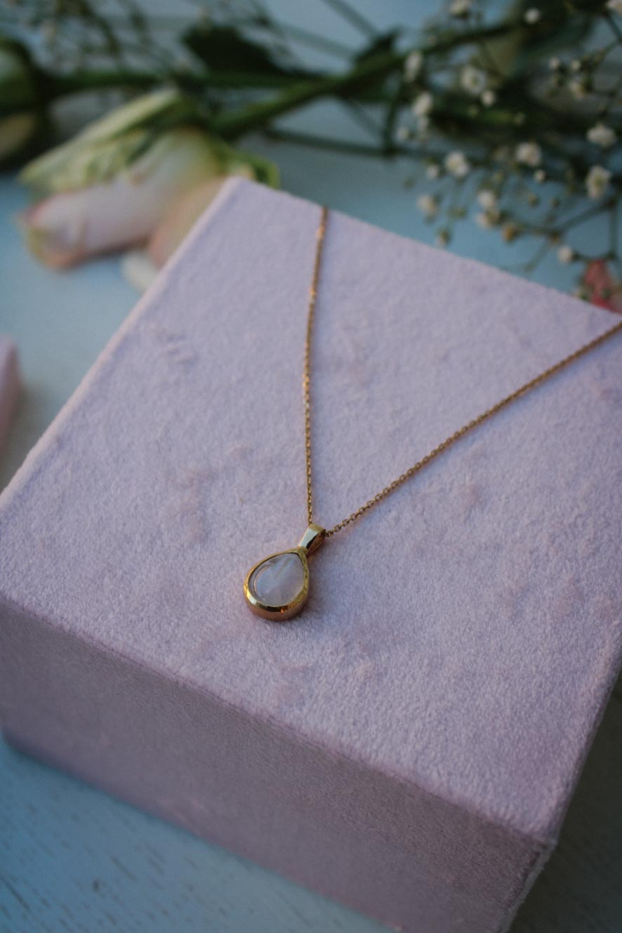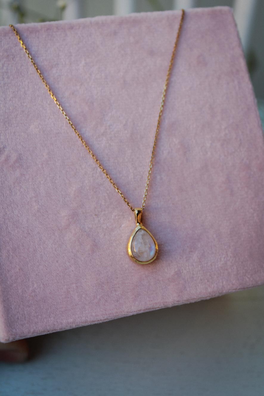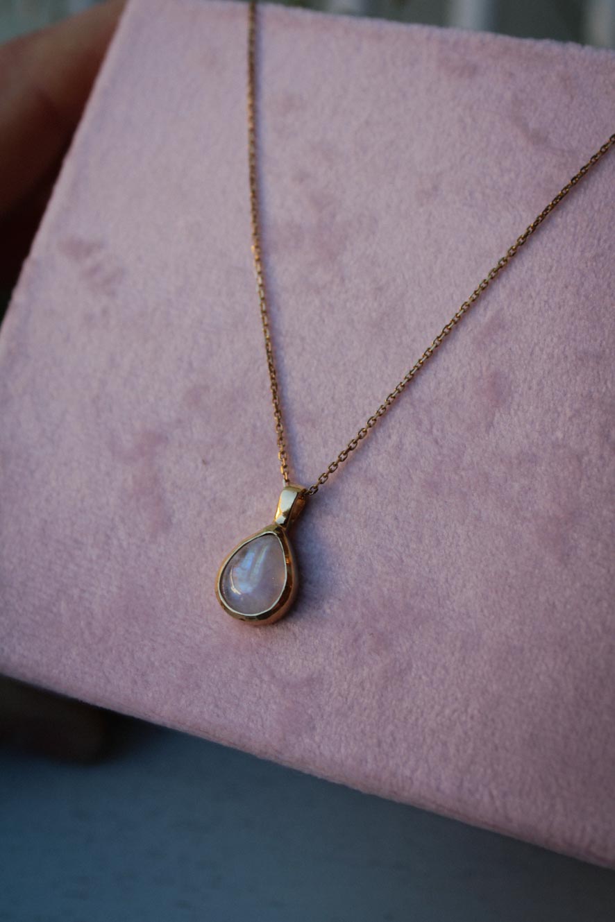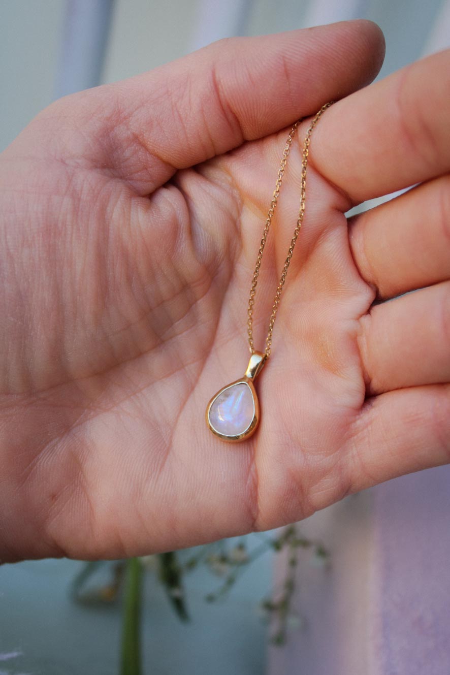 Sanft schimmernd wie Mondlicht: Der tropfenförmige Mondstein entfaltet in vergoldetem Silber seine geheimnisvolle, feminine Schönheit.