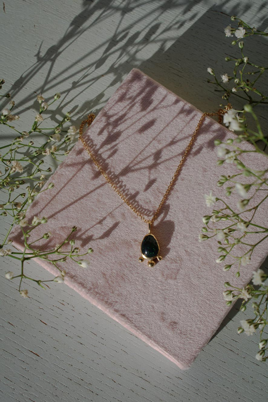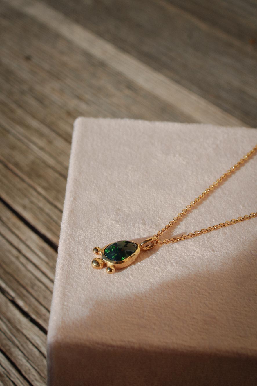 Der schwarze Opal-Anhänger zeigt ein faszinierendes Farbenspiel in Grün und Rot. Die Fassung wird von drei feinen Kugeln verziert, die dem Schmuckstück eine besondere Note verleihen.