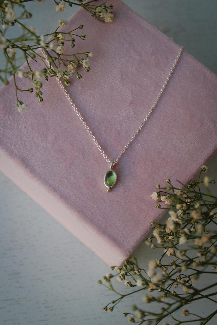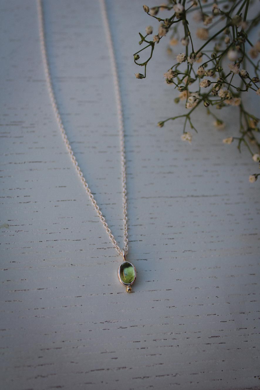 Wie ein Hauch von Frühling: Der hellgrüne Peridot in Silber, ergänzt durch eine kleine Goldkugel, macht diese Kette zu einem besonderen Blickfang.