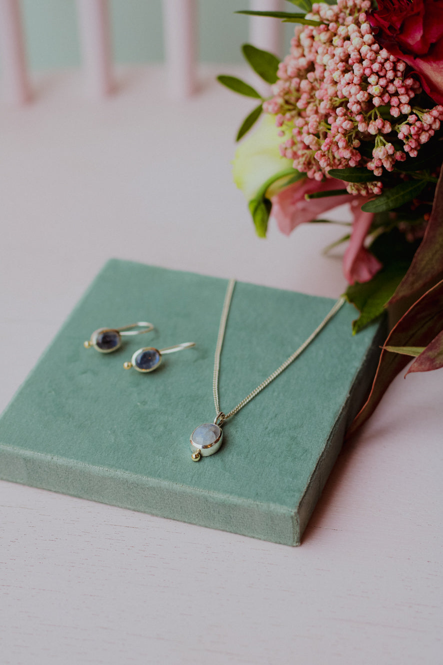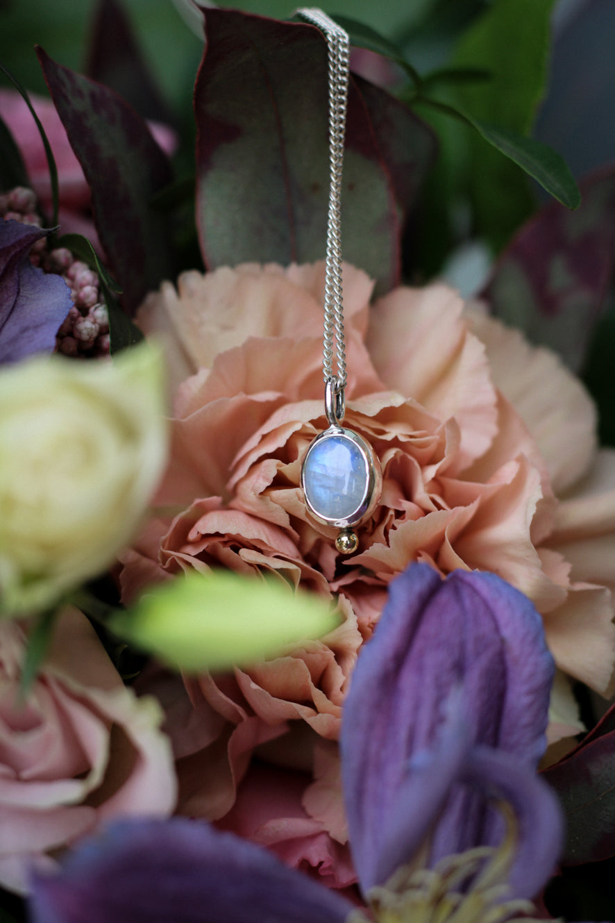 Mondstein mit Goldkugel und Silberkette